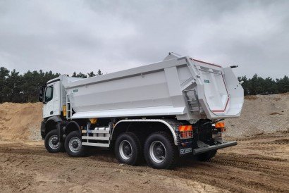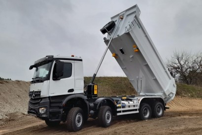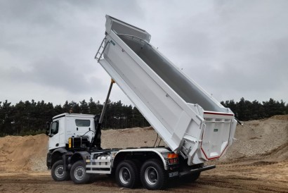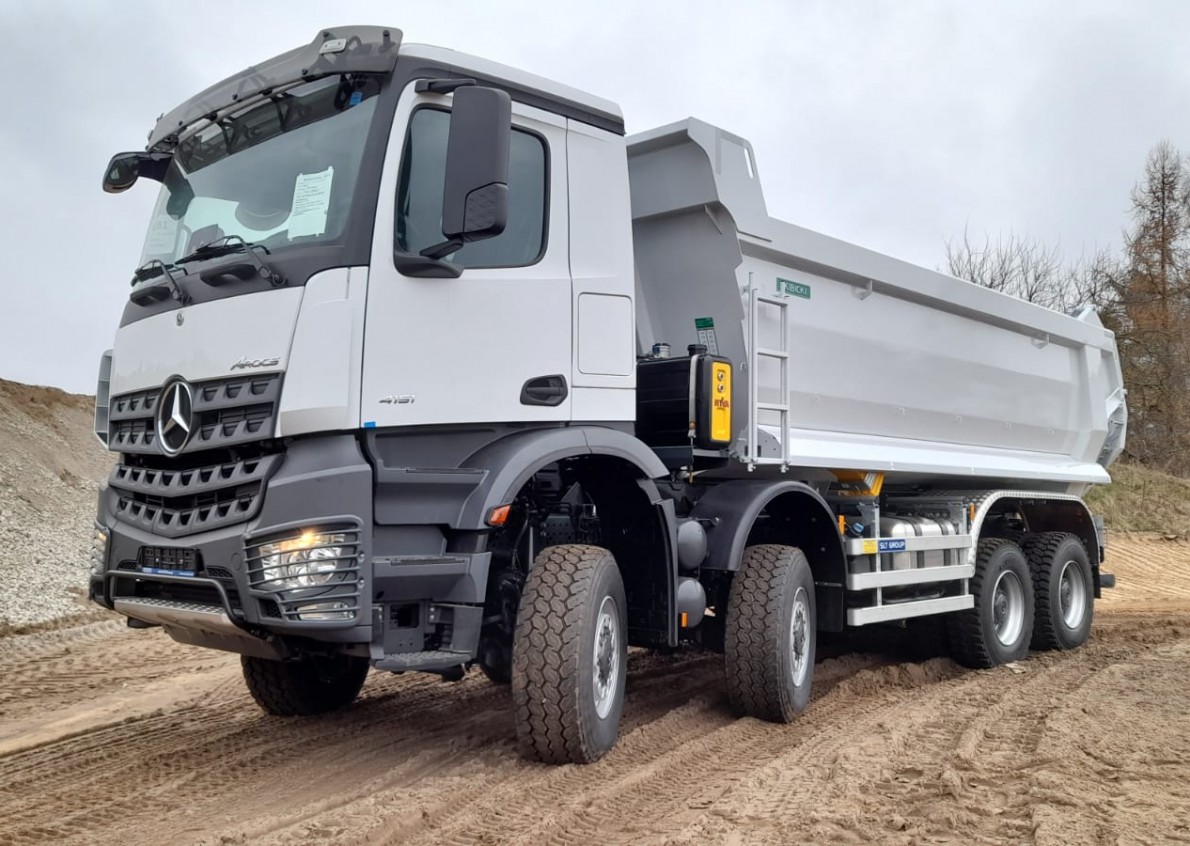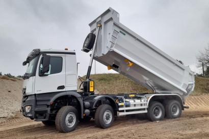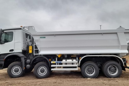 Galinio vertimo savivartis SKIBICKI kėbulas ant Mercedes Actros 4151 8x4 važiuoklės: 19 kūb.m. talpa, 6 mm. šonai ir 8 mm. grindys iš HARDOX plieno.