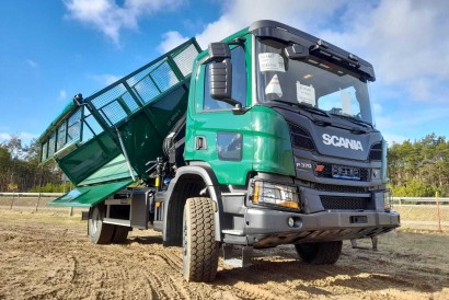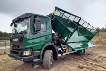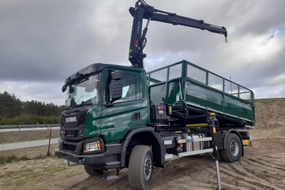 Universalus visureigis Scania P370 (4x4) savivartis sukomplektuotas tripusio vertimo kėbulu su antborčiais ir ypatingos komplektacijos manipuliatoriumi HIAB X HiPro 122 E-2