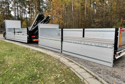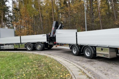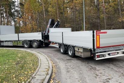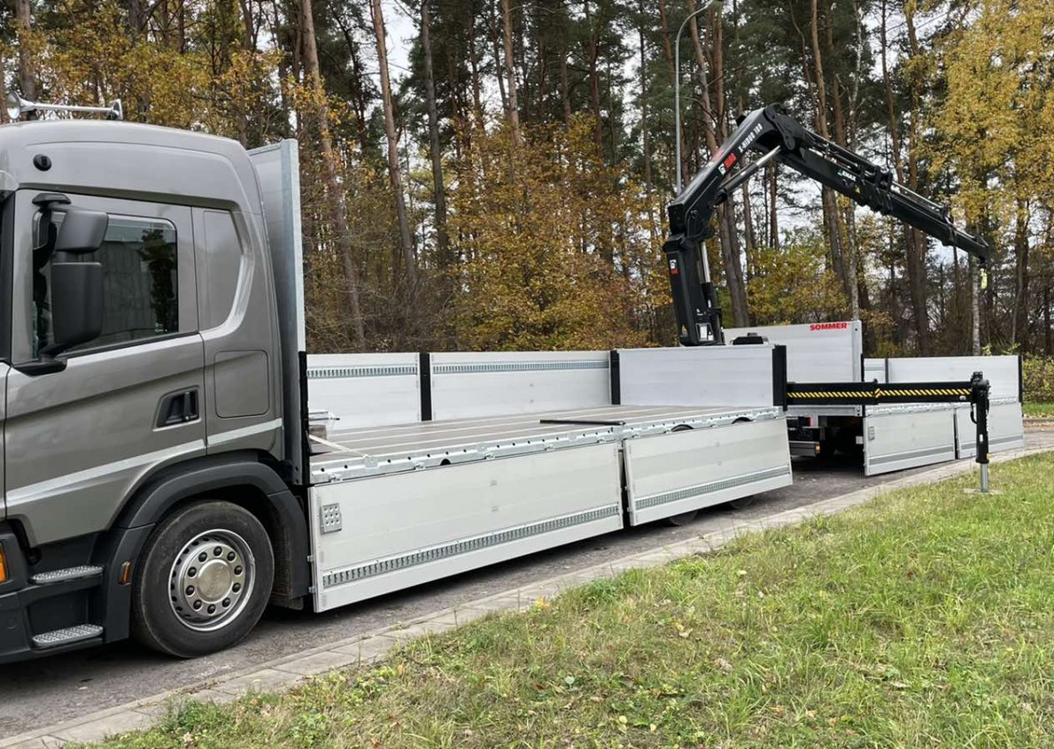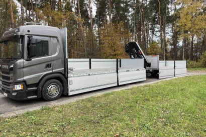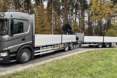 Scania stiklovežis: specialus bortinis kėbulas skirtas stiklo paketų transportavimui, HIAB X HiDuo 188 E-5 manipuliatorius ir centrinių ašių priekaba.
