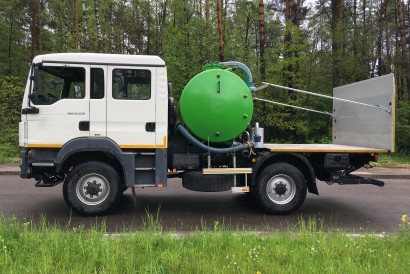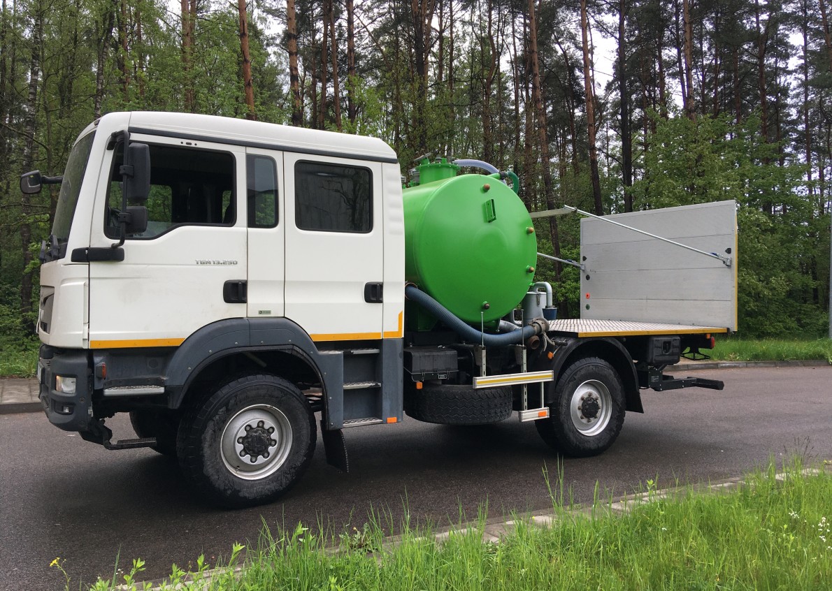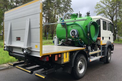 Specialus užsakymas: klientui ant jo naudotos MAN TGM13 4x4 važiuoklės atnaujinome ir sumontavome biotualetų aptarnavimo ir transportavimo antstatą su Zepro Z1500 galinio borto keltuvu.